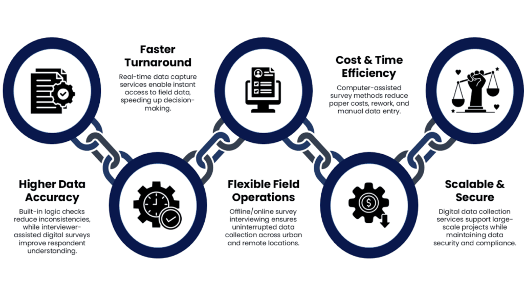 Unlike traditional paper-based surveys, CAPI uses programmed questionnaires that improve accuracy, consistency, and efficiency throughout the research process.